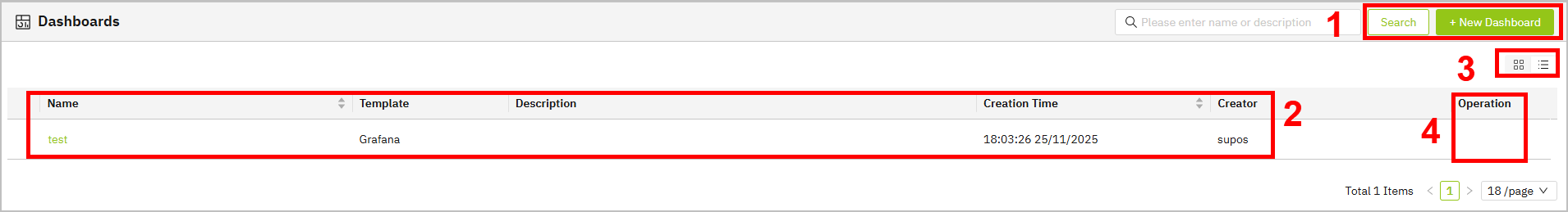| 2 | Dashboard List | Displays dashboard information. Click the name to start editing. |