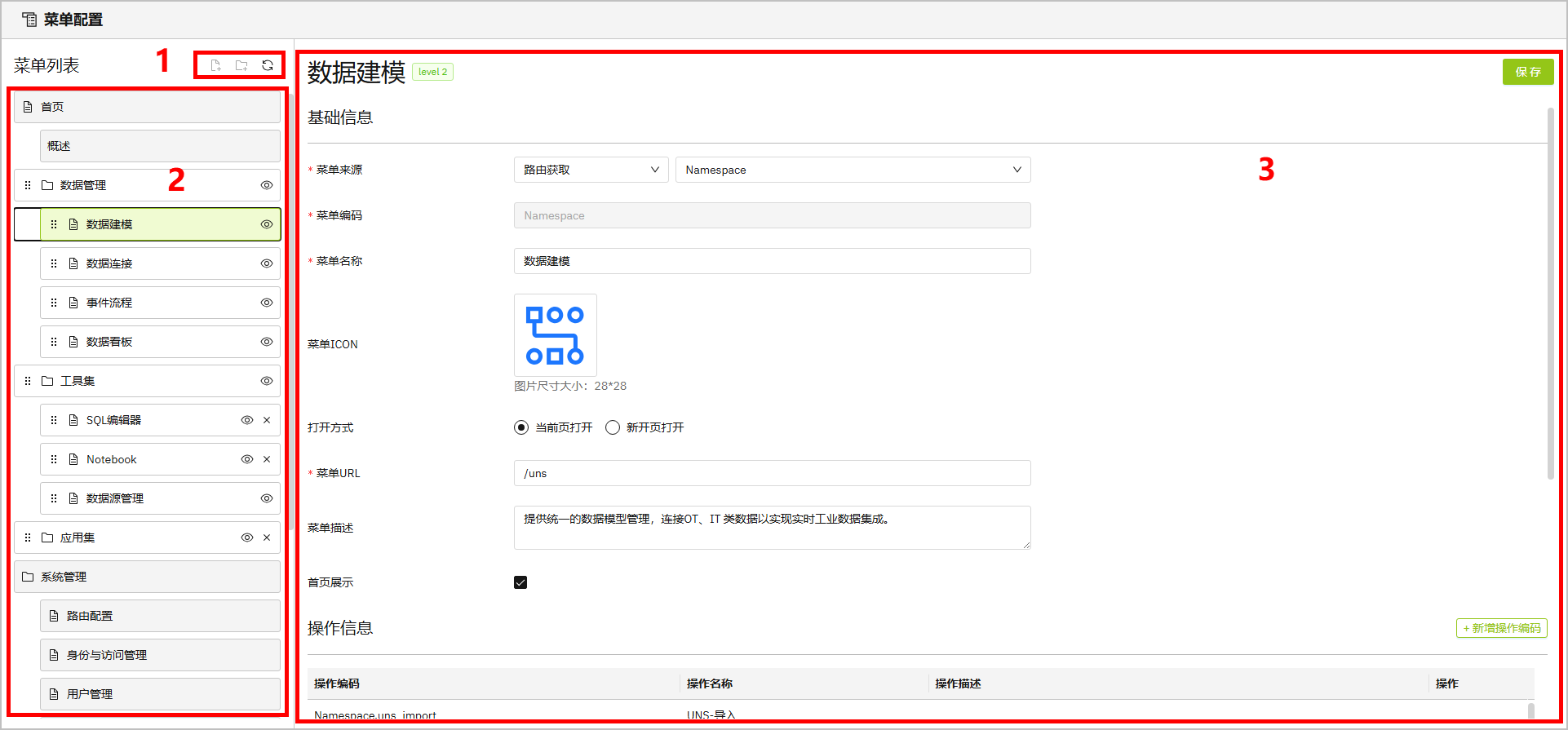 平台默认提供的原始菜单,请勿修改其菜单来源、地址及操作编码,否则可能导致模块无法正常使用。