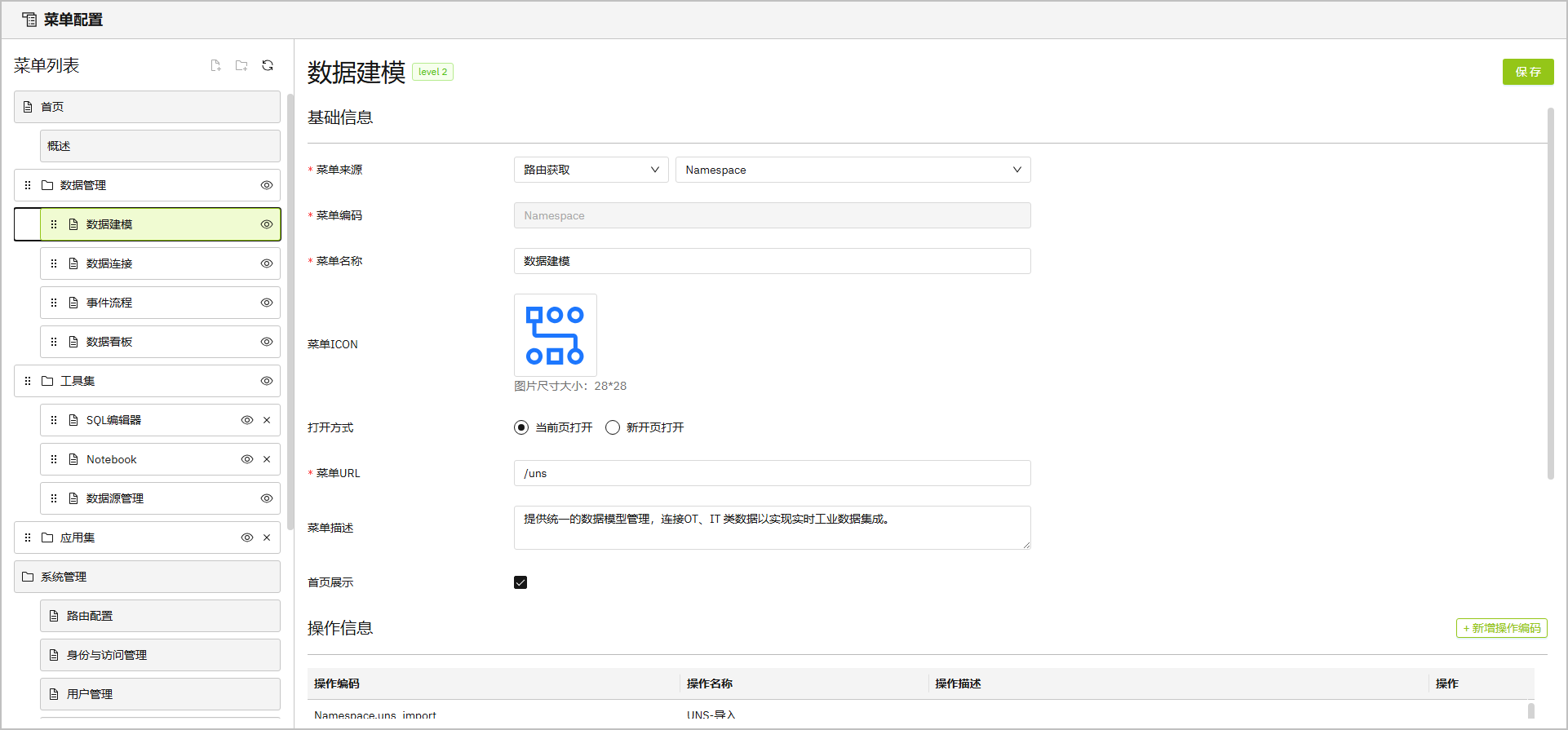 2. 从列表中选中目标菜单,在右侧编辑其信息后,单击 保存