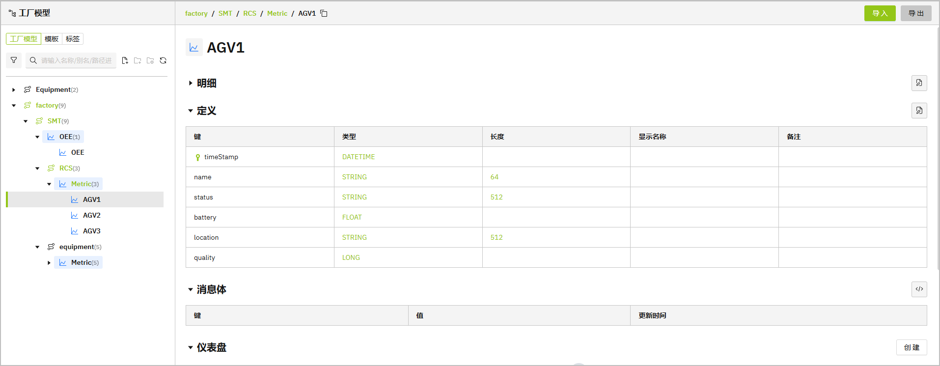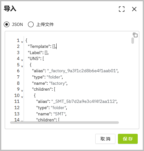 2. 单击右上角的 导入,输入模型JSON数据。